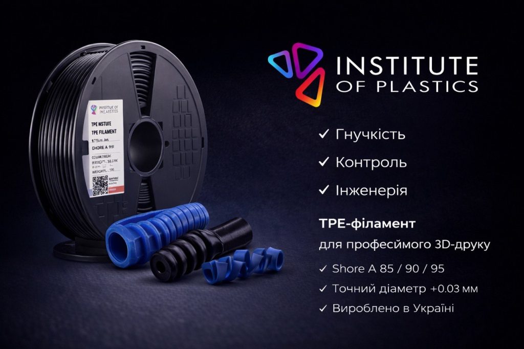 TPE Filament від Institute of Plastics — це еластичний матеріал на основі SEBS, розроблений для стабільного друку гнучких деталей: ущільнень, демпферів, грипсів, чохлів, шарнірів та функціональних елементів. Ми контролюємо рецептуру, компаундування та екструзію філамента, щоб забезпечити повторювану якість і прогнозований результат на принтері.